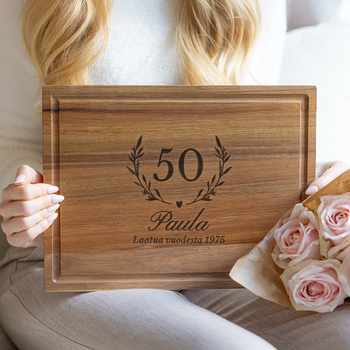 Näppärän kokoinen akaasialeikkuulauta kaiverruksella on upea lahjaidea jokaiselle kotikokille. Leikkuulauta omalla tekstillä on lisäksi persoonallinen ja kaunis elementti kattaukseen.
