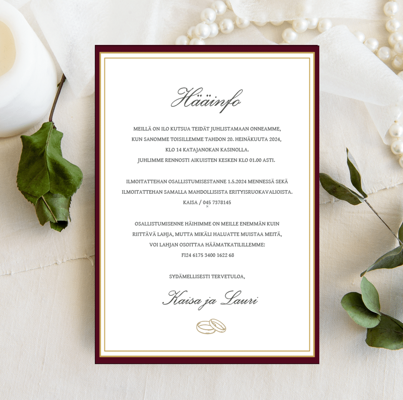 Hääkutsun materiaali on korkealaatuista, 400g paksuista mattakartonkia. Painatus tehdään kaksipuoleisena. Meiltä löydät kauniit hääkutsut juuri omien toiveidesi mukaan! Hääkutsujen hintaan kuuluu tarvittaessa henkilökohtainen palvelu suomeksi suunnittelijan kanssa.