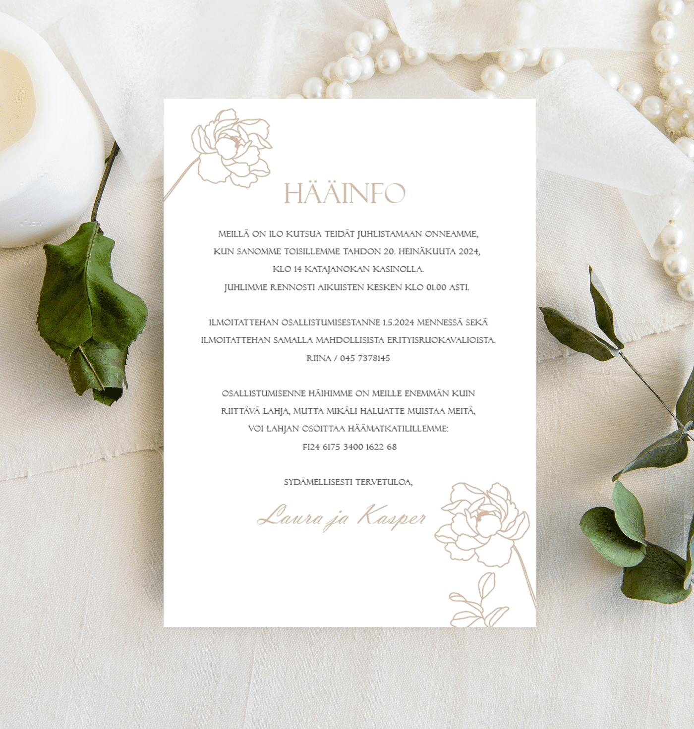 Valmis hääkutsumalli omilla teksteilläsi on vaivaton keino luoda kauniit hääkutsut. Cream Petals-kutsussa on kauniin hillitty värimaailma. Hääkutsun materiaali on korkealaatuista, 400g paksuista mattakartonkia. Painatus tehdään kaksipuoleisena. Meiltä löydät kauniit hääkutsut juuri omien toiveidesi mukaan! Hääkutsujen hintaan kuuluu tarvittaessa henkilökohtainen palvelu suomeksi suunnittelijan kanssa. Huom. kutsussa ei ole kultafoliointia.