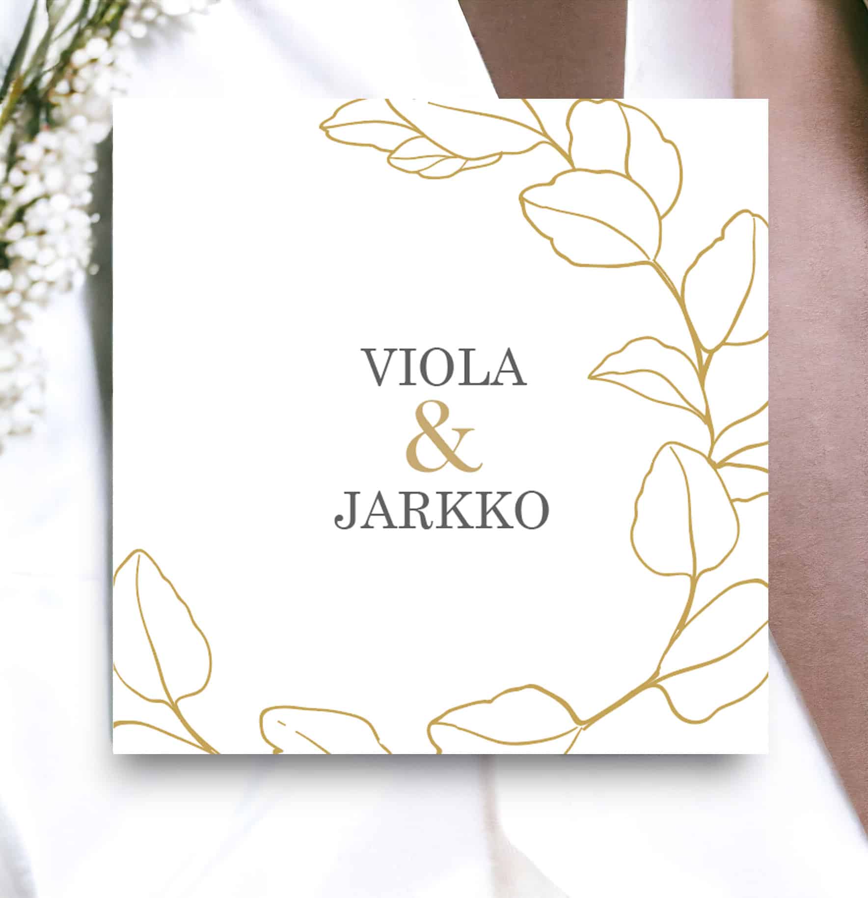 Valmis hääkutsumalli omilla teksteilläsi on helppo tapa luoda kauniit hääkutsut vaivattomasti. Golden love-hääkutsua koristavat herkät, kullansävyiset lehdet (huom. ei kultafoliointi). Hääkutsun materiaali on korkealaatuista, 400g paksuista mattakartonkia. Painatus tehdään kaksipuoleisena. Meiltä löydät kauniit hääkutsut juuri omien toiveidesi mukaan! Hääkutsujen hintaan kuuluu tarvittaessa henkilökohtainen palvelu suomeksi suunnittelijan kanssa.
