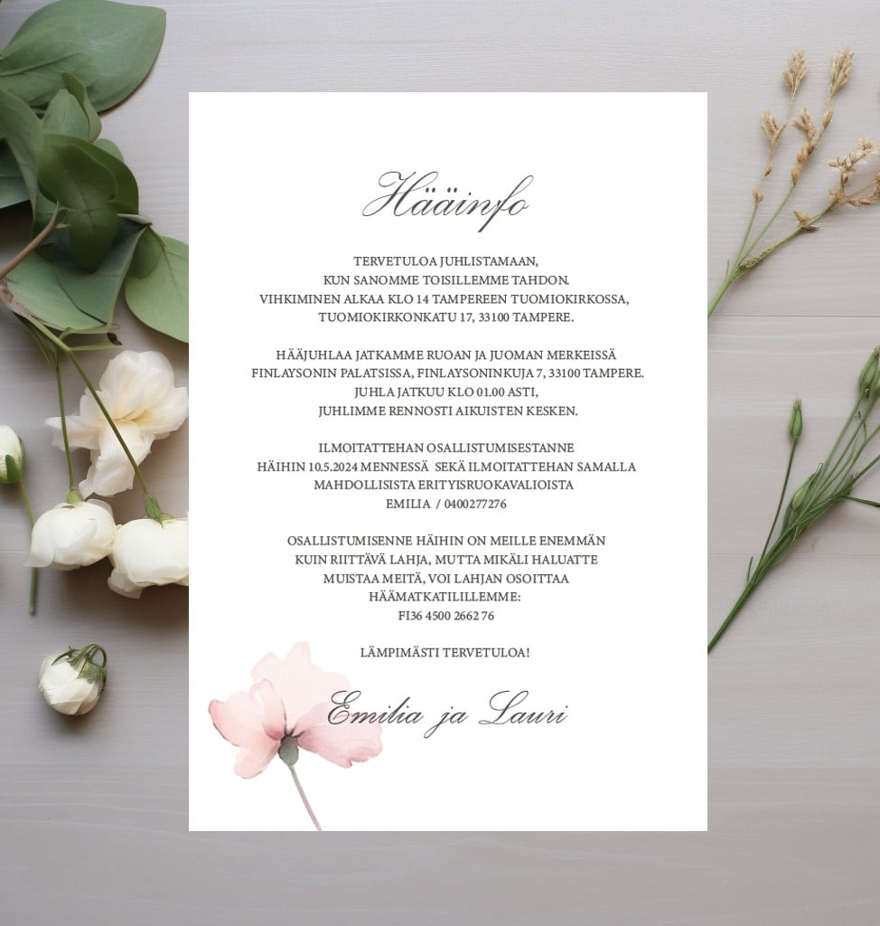 Valmis hääkutsumalli omilla teksteilläsi on vaivaton keino luoda kauniit hääkutsut. Whispering Love-kutsu huokuu yksinkertaista herkyyttä. Hääkutsun materiaali on korkealaatuista, 400g paksuista mattakartonkia. Painatus tehdään kaksipuoleisena. Meiltä löydät kauniit hääkutsut juuri omien toiveidesi mukaan! Hääkutsujen hintaan kuuluu tarvittaessa henkilökohtainen palvelu suomeksi suunnittelijan kanssa.