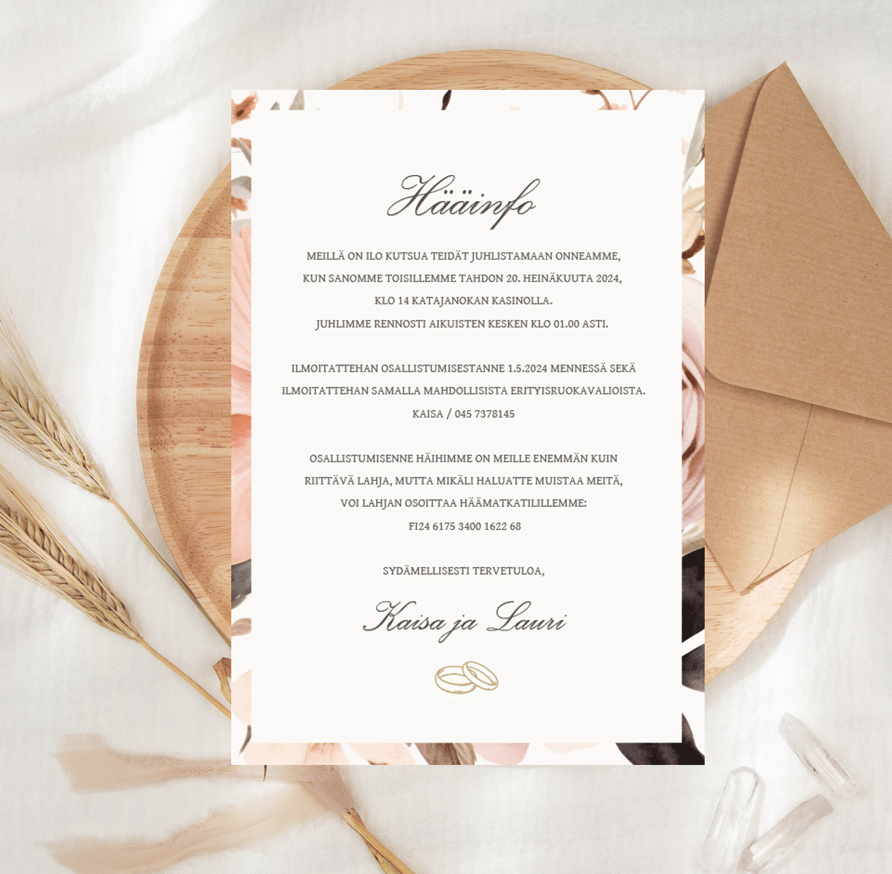 Kuoret eivät kuulu hintaan. Jotkut hääpareista haluaa tehdä kuoret itse, joten tästä syystä emme sisällytä kuoria hääkutsuihin. Näin maksat vain siitä mitä tarvitset. Halutessasi voit tilata hääkutsuihimme sopivia kirjekuoria esimerkiksi täältä: Suomikirjekuoret