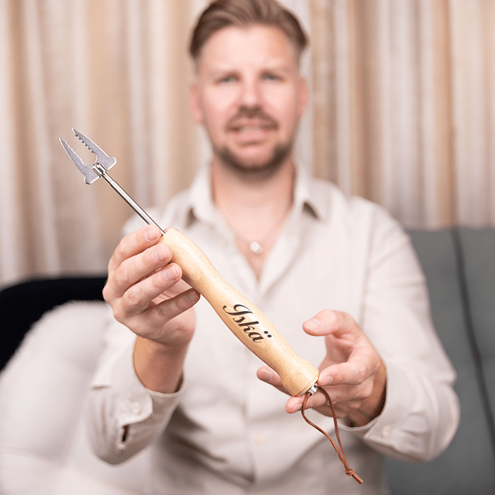Makkaratikku kaiverruksella on mitä parhain isänpäivälahja papalle, omalle isälle tai kenelle vain luonnosta ja grillailusta nauttivalle! Makkaratikku on sekä käytännöllinen, että tyylikäs lahjaidea. Makkaratikku on pieneen kokoon mahtuva ja avautuu kokoon 80 cm. Nahkaremmillä saa tikun ripustettua kätevästi naulaan tai reppuun kiinni.