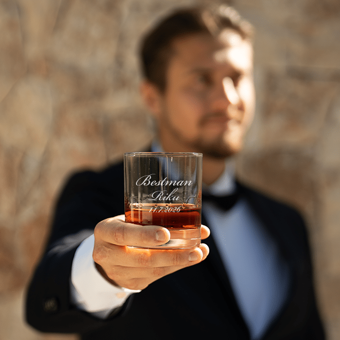 Mikä olisikaan parempi kiitoslahja bestmanille kuin viskilasi omalla henkilökohtaisella kaiverruksella, ja sopisiko kylkeen kentis pullo hänen lempiviskiään?