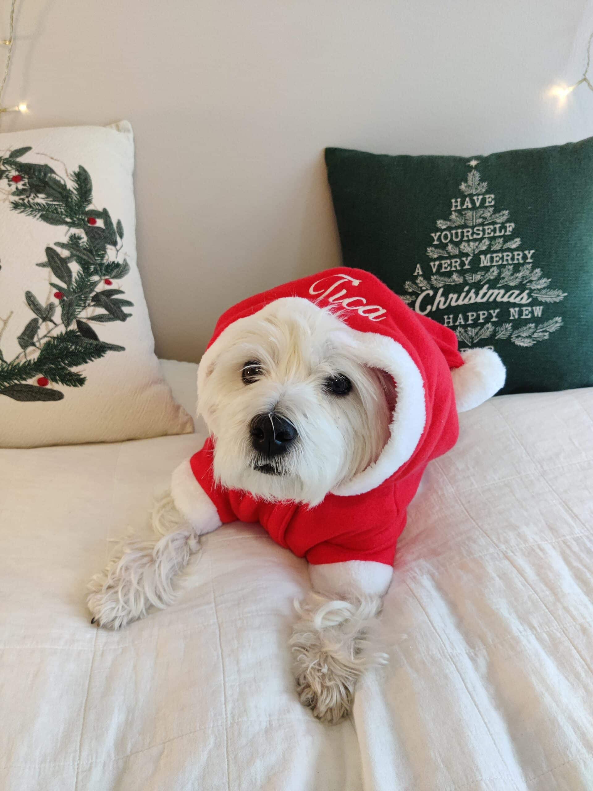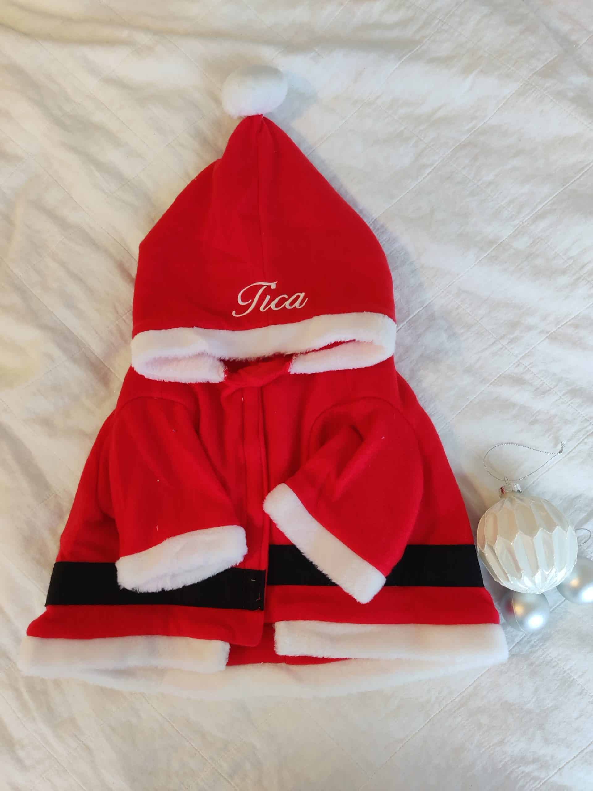 Tämä suloinen ja ihastuttava koiran tonttuasu sopii hyvin jouluisiin valokuviin, sekä joulutapahtumiin tuomaan iloa ja joulumieltä. Koiran asuun kirjaillaan koiran oma nimi.