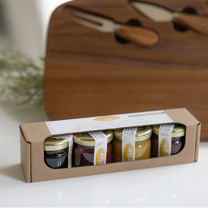 Juustojen täydelliseksi makupariksi setti sisältää suomalaisen Hommanäsin hillolajitelman – neljä erilaista makua, jotka kruunaavat juustohetken: mustikka, vadelma, mansikka ja appelsiini.