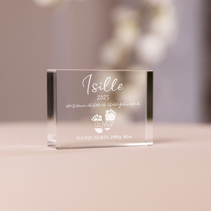 Lasikoriste omalla kaiverrustekstillä on mitä ihanin lahja isälle esimerkiksi ensimmäiseen isänpäivään. Voit kaiverruttaan tähän eleganttiin ja tyylikkääseen lasikoristeen esimerkiksi lapsen syntymätiedot. Tuote toimitetaan tyylikkäässä valmiissa rasiassa, jossa lahja on kätevä antaa.
