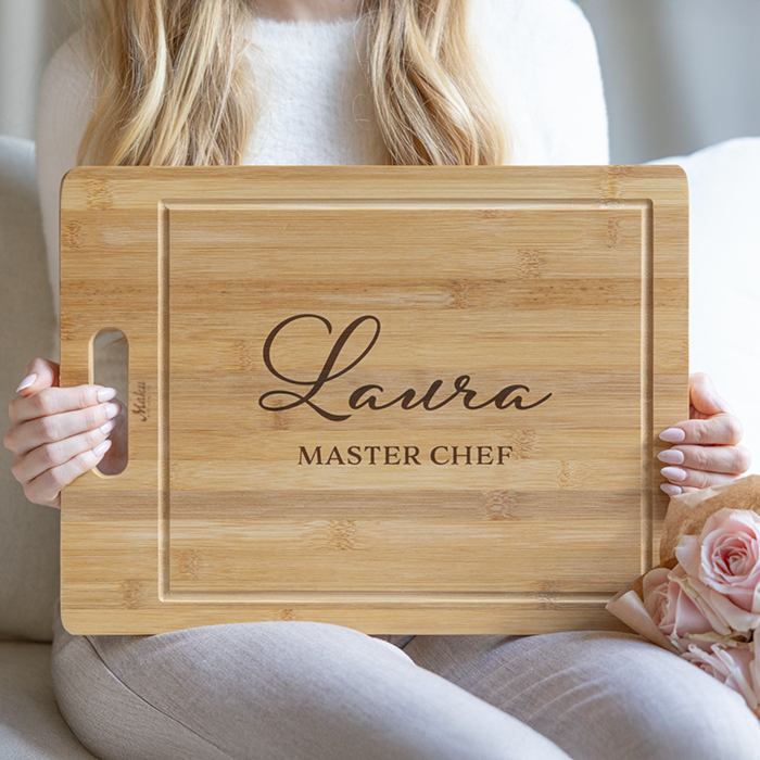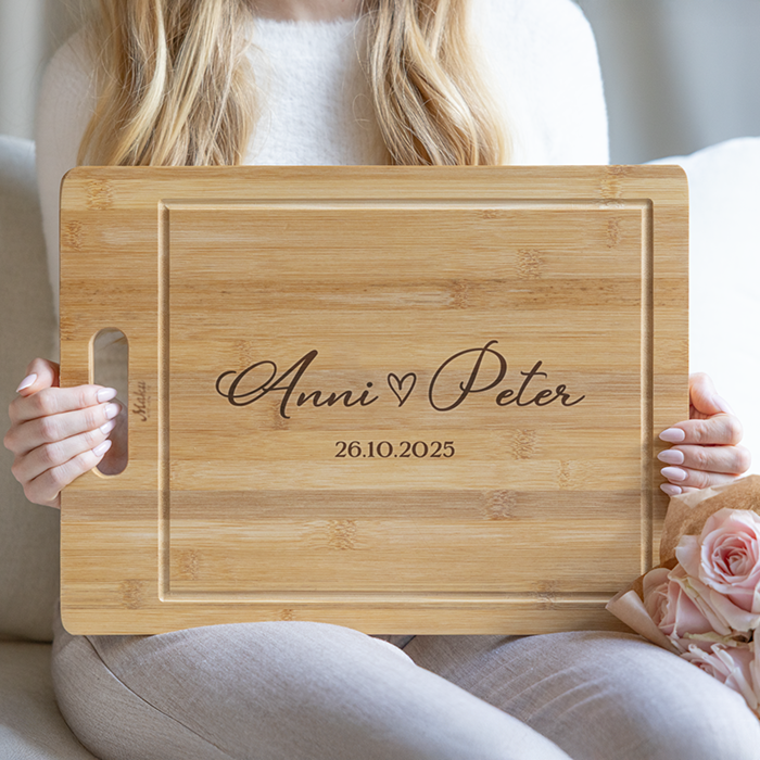 Näyttävän kokoinen leikkuulauta kaiverruksella on upea lahjaidea jokaiselle kotikokille! Leikkuulauta omalla tekstillä on persoonallinen elementti kattaukseen, joka puhuttaa varmasti.  Tyylikäs kaiverrettu bambuleikkuulauta on hellä veitsille ja hyvä alusta ruoanlaitolle. Lauta sopii hyvin myös tarjoilualustaksi esimerkiksi juustoille, leikkeleille ja hedelmille.  Luonnonmateriaali toimii kauniina, maanläheisenä sisustuselementtinä keittiössä, joten tässä sekä hyvä lahja kokille, mutta myös ihana sisustuslahja!Ota mallia valmiista kaiverrusideoista tai ideoi itse miten ilahduttaa lähimmäistäsi tai oman kodin sisustusta.  Mikäli haluat sydämen kuvan, voit merkitä sen tekstiin merkein <3.