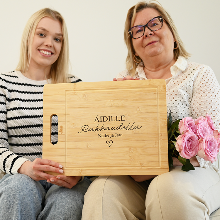 Äidille kaiverrettu oma leikkuulauta on ihana henkilökohtainen lahjaidea. Voit itse suunnitella, millä sanoin haluat ilahduttaa äitiäsi. Voit ottaa mallia kuvien valmiista kaiverrusideoista tai keksiä täysin oman tekstin.