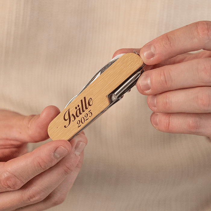Linkkuveitsessä on 9 erilaista toimintoa, kuten veitsi, ruuvimeisseli, pullonavaaja ja sakset, jotka helpottavat arkea niin metsäretkillä kuin mökilläkin. Runko on valmistettu laadukkaasta ruostumattomasta teräksestä ja kuori bambusta, joka tekee jokaisesta tuotteesta yksilöllisen. Bambu on elävä luonnonmateriaali, ja sen sävyerot voivat vaikuttaa kaiverruksen ulkonäköön – mikä tekee jokaisesta lin