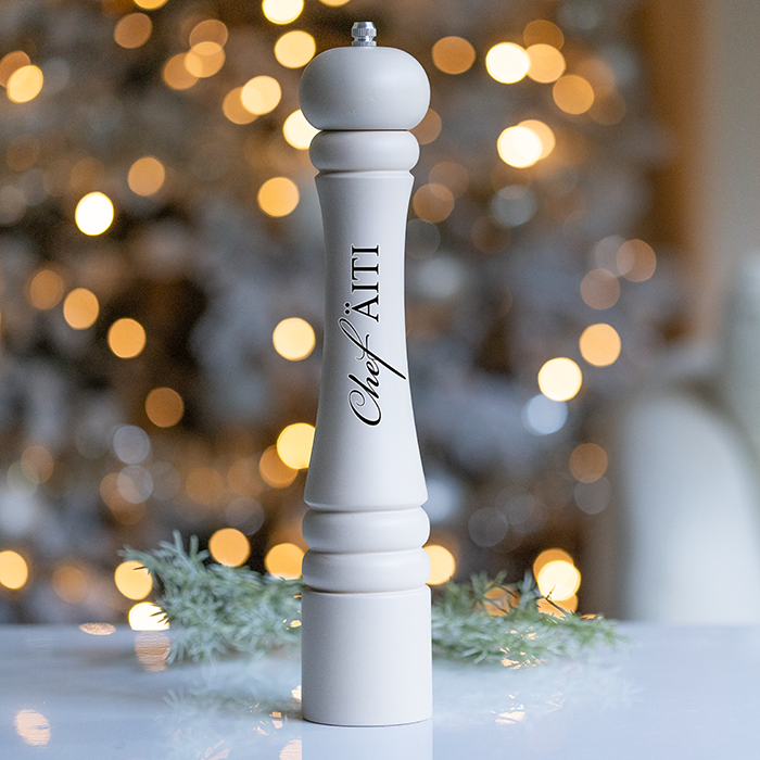 Laadukas, pyökistä valmistettu ja näyttävän korkea maustemylly on klassisen tyylikäs valinta joululahjaksi. Nimikoitu maustemylly toimii upeana sisustuselementtinä jokaisessa keittiössä ja ruokapöydässä.