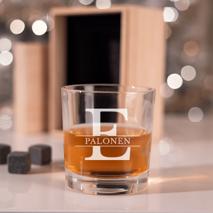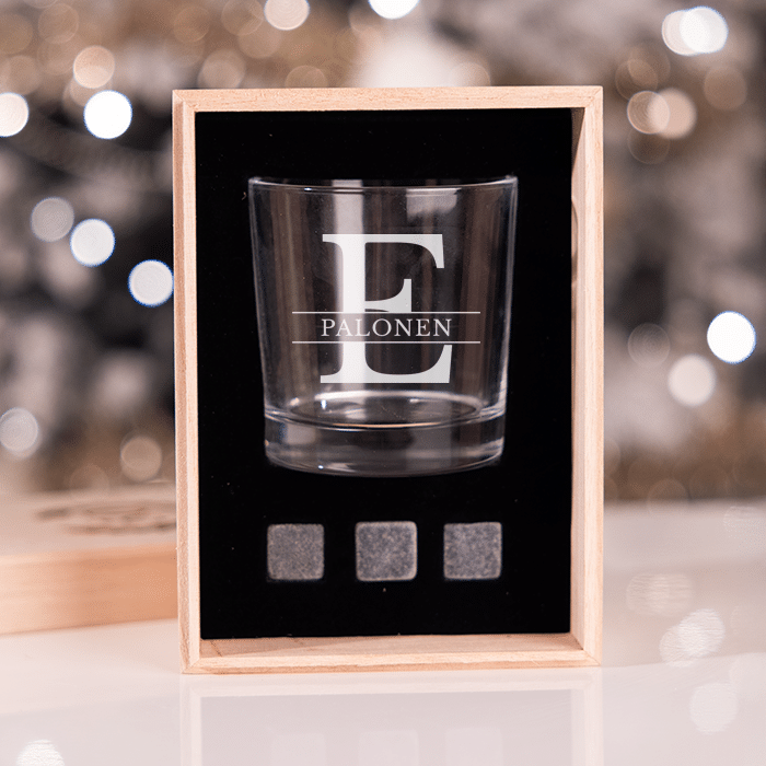 Mukana tuleva yksilöity viskilasi ja viskikivet viimeistelevät kokonaisuuden. Viskilasiin kaiverrretaan oma yksilöity teksti, joten lahjasta tulee takuulla yksilöllinen ja henkilökohtainen, joka kestää aikaa ja josta säilyy muisto vielä vuosienkin päästä.