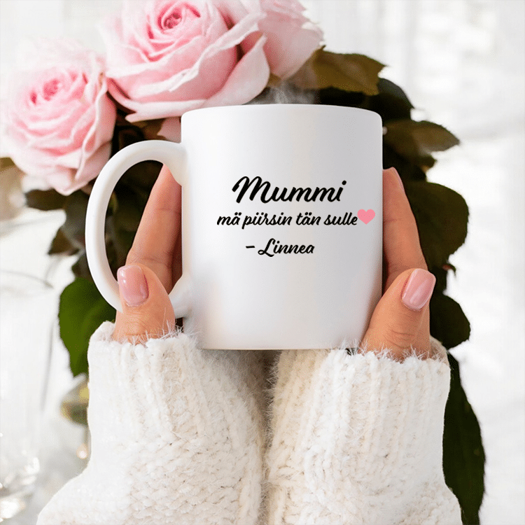 Muki lapsen omalla piirustuksella ilahduttaa äitiä tai mummia taatusti jokainen aamu. Muki on sekä käytännöllinen, että myös yksilöllinen äitienpäivälahja. Voit tilata mukin joko oman tekstin kanssa, joka painetaan mukin toiselle puolelle (+3€) tai pelkällä piirustuksella. Ota mallia tuotekuvista tai keksi aivan omanlainen teksti!