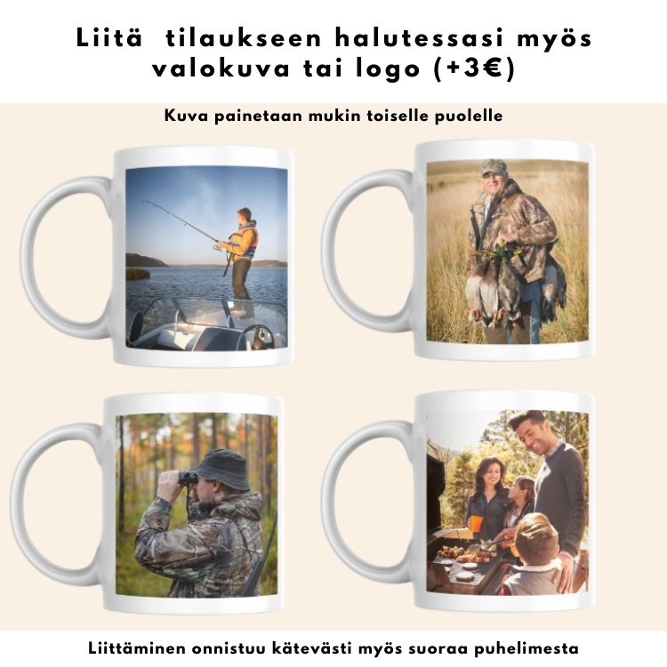 Muki painatuksella on loistava lahjaidea, joka ilahduttaa päivästä toiseen. Muki on sekä käytännöllinen, että myös yksilöllinen lahjaidea. Tähän mukiin voit valita haluamasi eläinkuvion tekstipuolelle (kala, hirvi tai karhu) Jokaista mukia on helppo räätälöidä oman maun mukaan. Voit tilata mukin joko valokuvan kanssa, joka painetaan mukin toiselle puolelle (+3€) tai pelkällä tekstillä. Ota mallia tuotekuvista tai keksi aivan omanlainen teksti! Voit myös jättää rivejä tyhjäksi.