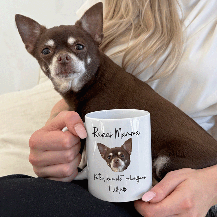 Ilahduta koiraäitiä tänä äitienpäivänä henkilökohtaisella lahjalla, joka saa hymyn huulille joka aamu! Tässä mukissa yhdistyvät sydäntä lämmittävä teksti ja oma valokuva rakkaasta karvakuonosta – täydellinen tapa juhlistaa koiraäidin erityistä päivää. Suunnittele teksti ja liitä vain kuva koirasta, niin suunnittelijamme rajaa koirasta ihanan otoksen mukin keskelle. Voit ottaa mallia valmiista teksti-ideoista tai keksiä aivan omanlaisen tekstin. Tassun kuvat painetaan automaattisesti tekstin loppuun.