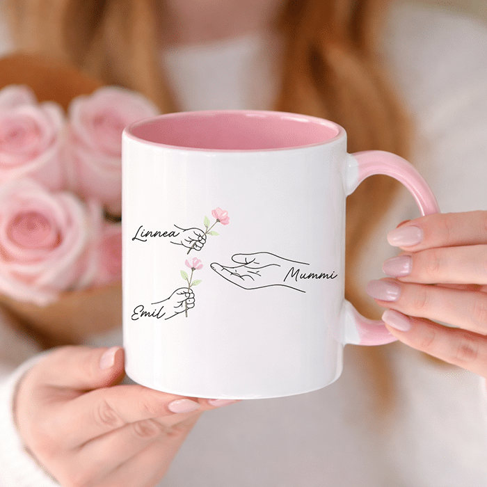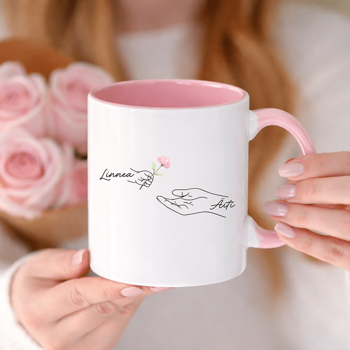 Muki painatuksella ilahduttaa äitiä taatusti jokainen aamu. Muki painatuksella on sekä käytännöllinen, että myös yksilöllinen äitienpäivälahja. Tästä mukista tekee ihanan se, että se on vaaleanpunainen sisältä ja kahvasta.