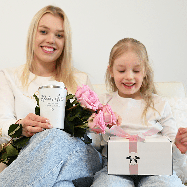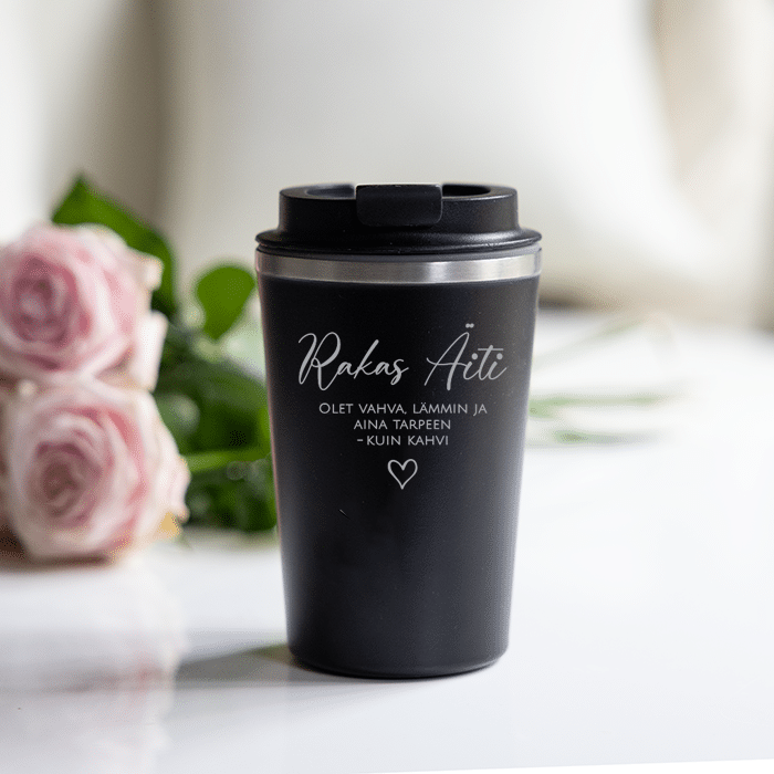 Termosmuki omalla tekstillä kaiverrettuna on yksilöllinen sekä käytännöllinen lahjaidea äidille tai mummille. Ota mallia teksteistä tai keksi millä sanoin ilahduttaa juuri omaa rakasta äitiä parhaiten. Termosmukin tuplarakenteen ansioista se säilyttää kuuman sekä kylmän juoman lämpötilan hyvin. Termosmuki on valmistettu ruostumattomasta teräksestä ja siinä on kierrekorkki, joka ei vuoda.
