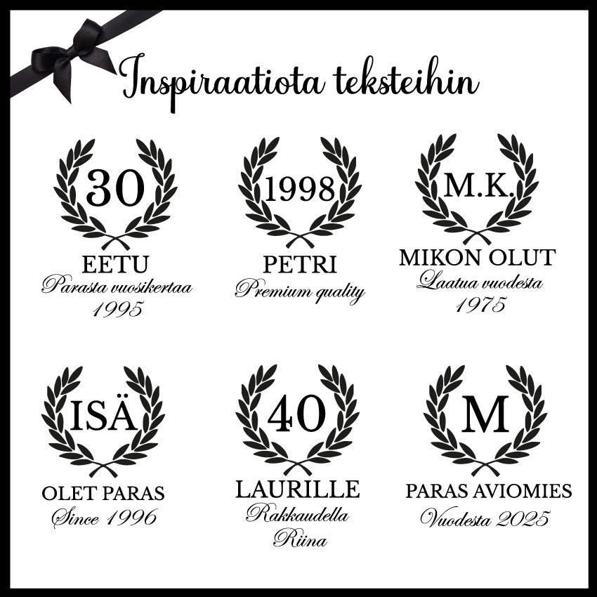 Oluttuoppi omalla kaiverruksella on taatusti hauska lahjaidea. Kaiverrettu tuoppi jää muistoksi, sillä kaiverrus on ikuinen, eikä se kulu tai haalistu pois. Vain mielikuvituksesi on rajana, millä sanoin ilahduttaa lahjansaajaa. Päätä vain tekstit ja tuoppi on valmis valmis tilattavaksi.