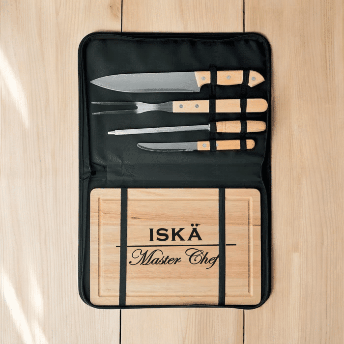 Tämä kokkaajan unelmasetti on täydellinen joululahja tai syntymäpäivälahja ruuanlaistosta nauttivalle. Setti sisältää neljä ruostumattomasta teräksestä valmistettua grillauslisävarustetta (lihaveitsen, veitsen, leikkuuhaarukan ja teroituspuikon) sekä leikkuulaudan polyesteripussissa. Setti sopii erinomaisesti kinkunpaistoon, lihanpaistamiseen kuin grillaukseenkin.