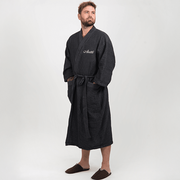Rento-saunatakki brodeerattuna nimellä tai muulla tekstillä