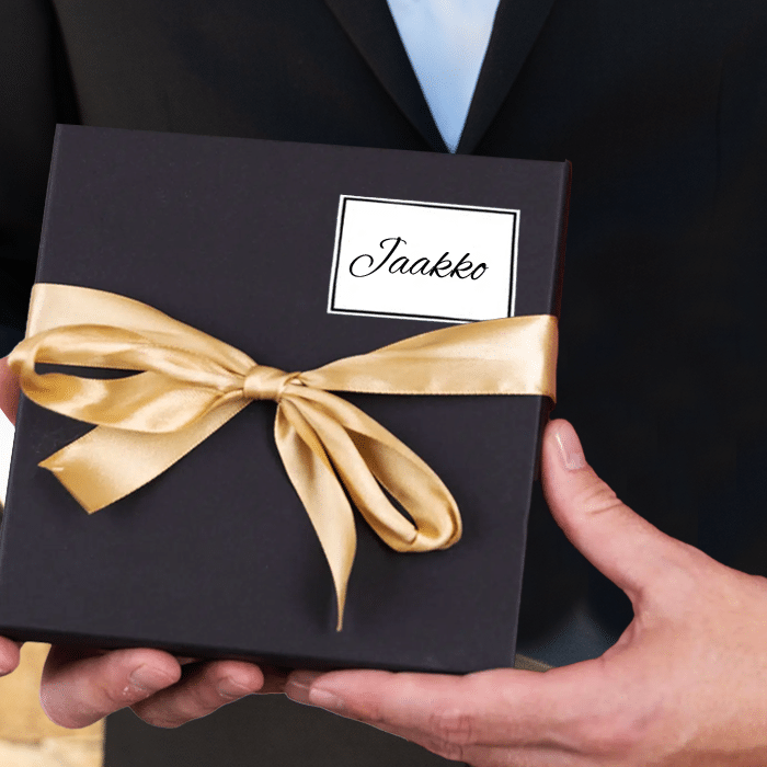 Taskumatti toimitetaan mustassa lahjapakkauksessa, joten lahja on tarvittaessa heti valmis annettavaksi. Viimeistele lahjapaketti halutessasi tarralla, johon voit valita kirjoituksen. Huom. Teemme kaiverruksesta mahdollisimman vastaavan sijoittelultaan kuin kuvassa. Tämä tarkoittaa sitä, että You Name It varaa oikeuden pieniin muutoksiin. Katso täältä taskumatti kaiverruksella myös toisella designilla.