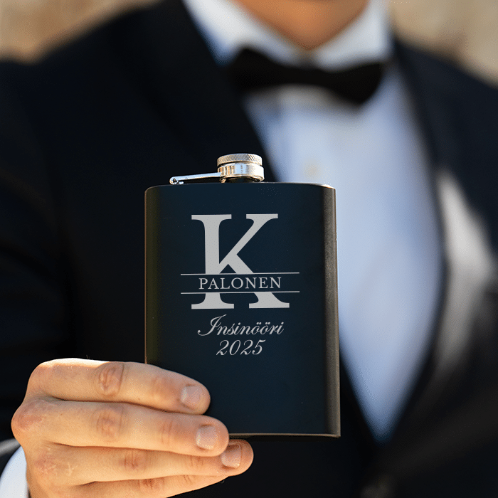 Taskumatti kaiverruksella on tyylikäs valmistujaislahja. Kaiverruta vaikkapa valmistuneen nimi ja tutkinto. Setti pitää sisällään taskumatin lisäksi myös kaksi tyylikästä shottilasia sekä suppilon, jonka avulla taskumatti on helppo täyttää.