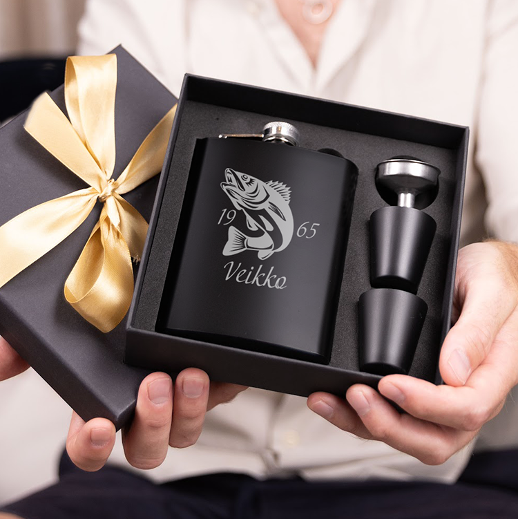 Ota lämmin hetki mukaasi kalaan, pilkille tai juhlahetkeen – tämä taskumatti on täydellinen seuralainen kalastajalle. Kaiverruksessa yhdistyvät yläosan vuosiluku, keskelle tuleva kalankuva ja alas oma nimi tai muu teksti. Näin jokaisesta taskumatista syntyy yksilöllinen ja arvokas lahja.