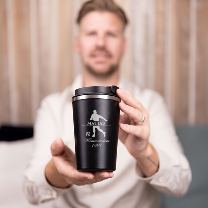 Tällä termosmukilla pitää kahvin kuumana. Omalla kaiverruksella tehty termosmuki on takuulla jokaisen jalkapalloa pelaavan tai fanittavan luottotuote. Kaiverrus tekee siitä aidosti yksilöllisen. Termosmukiin voit kaiverruttaa esimerkiksi nimen sekä henkilökohtaisen tekstin.