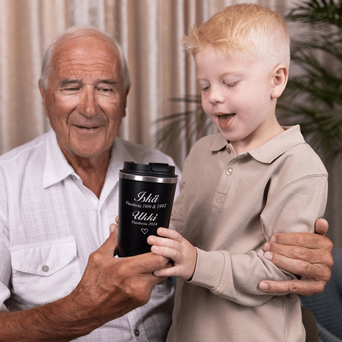 Termosmuki nimellä on mitä mainioin lahjaidea papalle. Parasta on, että voit itse valita, millä sanoin ilahduttaa isää tai pappaa. Matkatermosmuki on tehty korkealaatuisesta ruostumattomasta teräksestä, joka takaa parhaan käyttökokemuksen sekä tuotteen hyvän kestävyyden. Termosmuki kaiverruksella toimitetaan kauniissa lahjapakkauksessa, joten lahja isälle on siten heti valmis annettavaksi.