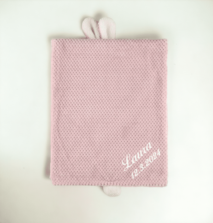 Suloinen ja pehmeä fleece-torkkupeitto pupunkorvilla ja tupsuhännällä sekä kirjailulla on ihana lahjaidea pienokaiselle. Voit itse suunnitella kirjailun, esim. lapsen nimi ja syntymäpäivämäärä. Peittoon voidaan kirjailla myös vaikkapa teksti ”kummilapselle”, mikäli nimi ei ole vielä tiedossa ennen kastejuhlaa. Tuote toimitetaan kauniissa lahjapakkauksessa, joten lahja on heti valmis annettavaksi.