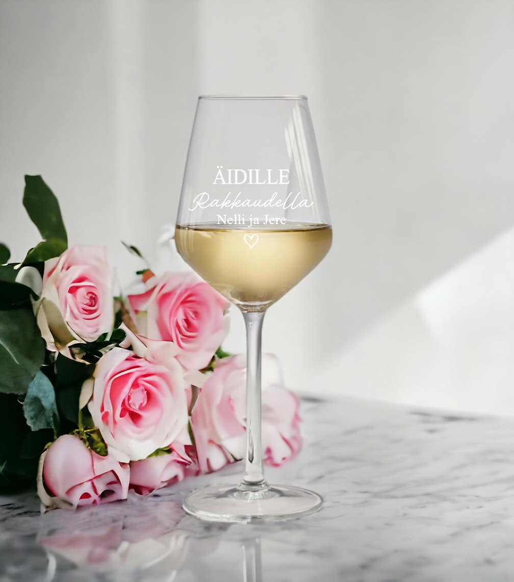 Valkoviinilasi itse suunnitellulla kaiverrustekstillä on ilahduttava lahjaidea. Kaiverrettu viinilasi jää ihanaksi muistoksi, sillä kaiverrus on ikuinen, eikä se kulu tai haalistu pois. Koska voit valita tekstin kokonaan itse, on lasi loistava äitienpäivälahja tai muu muistaminen läheiselle. Tuote toimitetaan valmiissa lahjapakkauksessa, joten lasi on heti valmis annettavaksi.
