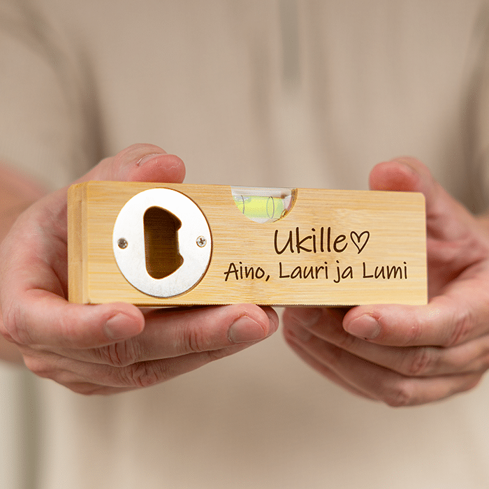 Bambusta valmistettu vatupassi ja pullonavaaja on hauska lahjaidea jokaiselle tee-se-itse miehelle. Suunnittele itse teksti ja räätälöi tuotteesta vaikkapa ihana isänpäivälahja.