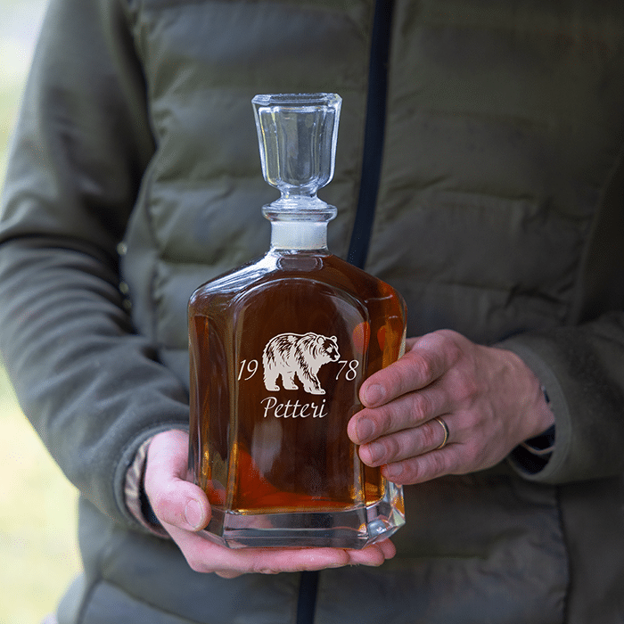 Karahvisetti – Oma eräeläin ja kaiverrus (karahvi + 2 viskilasia)